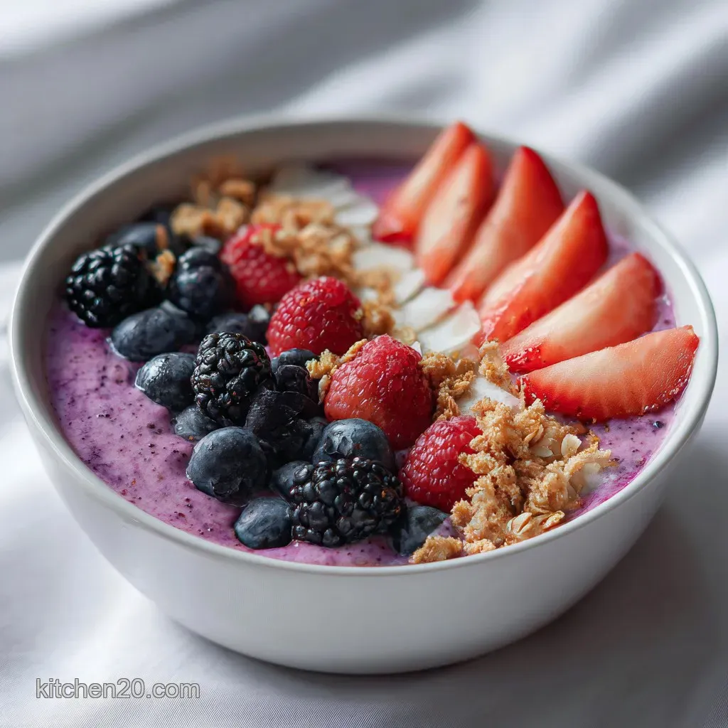 As the mixture transforms, the air in the kitchen fills with the sharp, frost tipped aroma of wild blueberries and tart raspberries. This berry smoothie bowl recipe follows a quick, 5 ingredient principle.