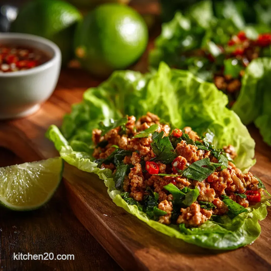 Store the Larb filling separately from the fresh lettuce wraps in an airtight container in the refrigerator for up to 3 days. To reheat, warm the filling gently on the stovetop over low heat, adding a splash of water or fresh lime juice if the mixture seems too dry after cooling.