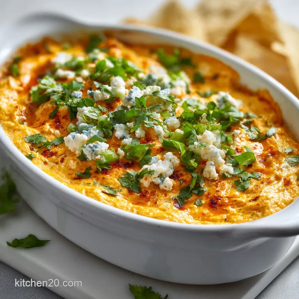 Bake and serve directly in a well seasoned cast iron skillet. The black iron provides a beautiful contrast to the orange dip and golden cheese. Scatter thinly sliced green onions over the top right before serving to add a fresh, crunchy element that cuts through the richness.